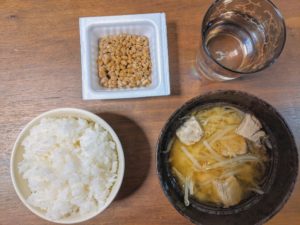 私が実際に毎日食べている食事は、ごはん、鶏肉や野菜の入った具沢山の味噌汁、納豆やキムチといった腸内環境を整えてくれるもの、これを基本としています。私の場合だと、汁に菜も含まれているような食事です。意識しているのはタンパク質と炭水化物をしっかり摂り脂質をなるべく抑えること(PFCバランス)さらに、腸内環境を整えて栄養の吸収効率を高めています。