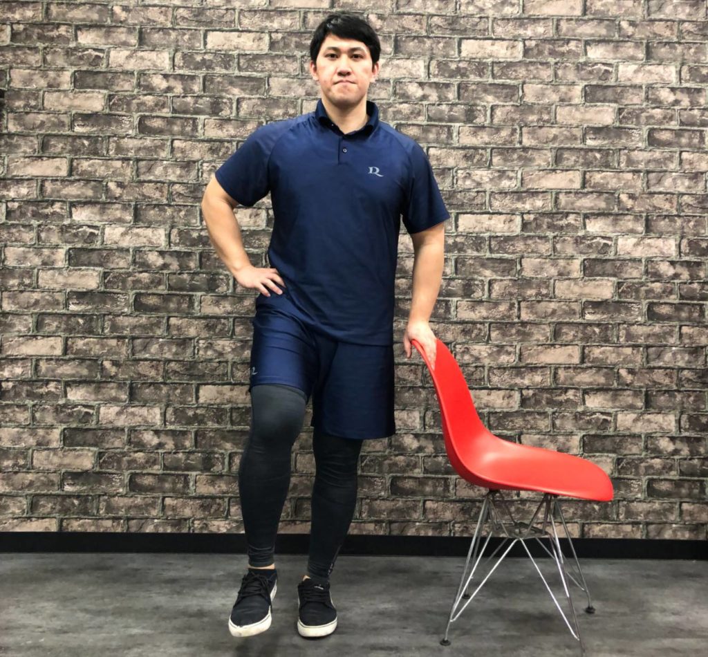 ✅椅子や壁に手をあて支えていきます。片膝を軽く曲げて床から浮かしましょう。