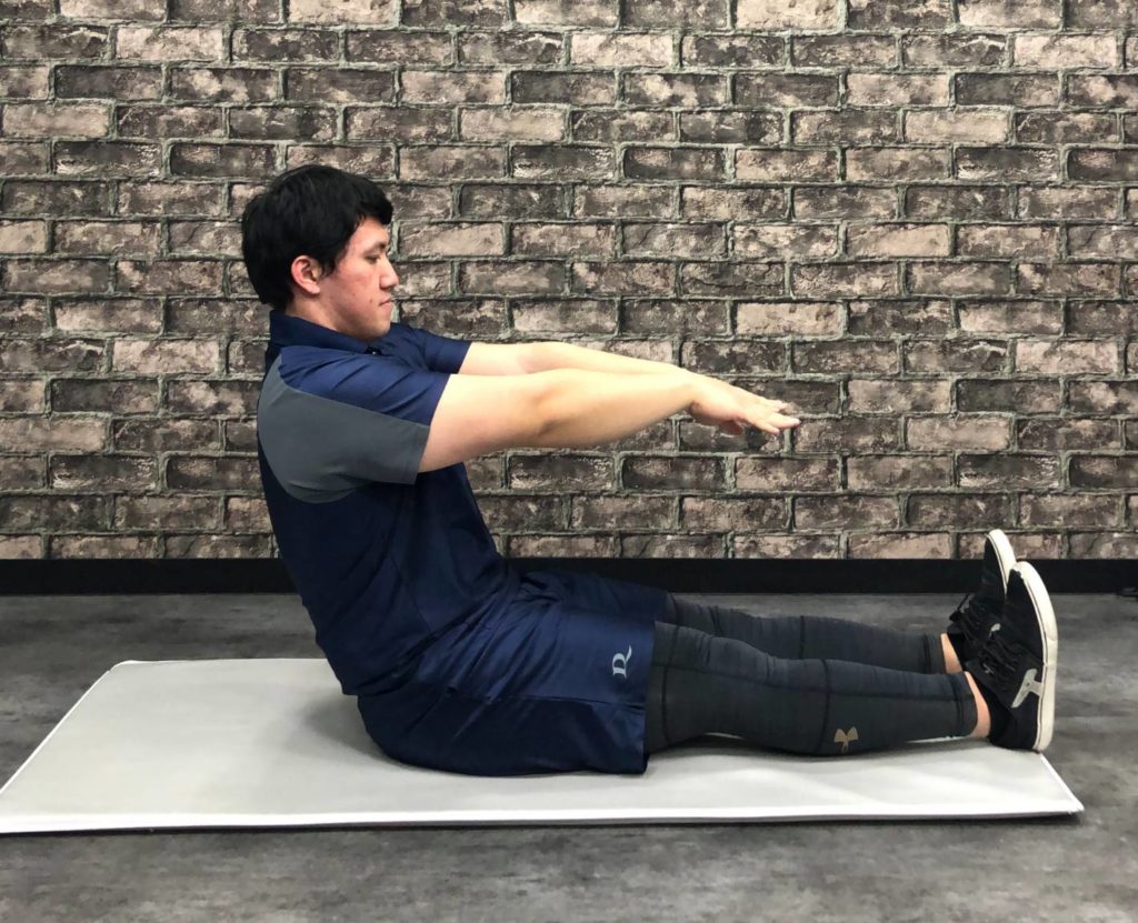 ✅長座になり身体を少し後ろに倒します。この時腕は真っ直ぐ前に伸ばしてバランスをとりましょう。