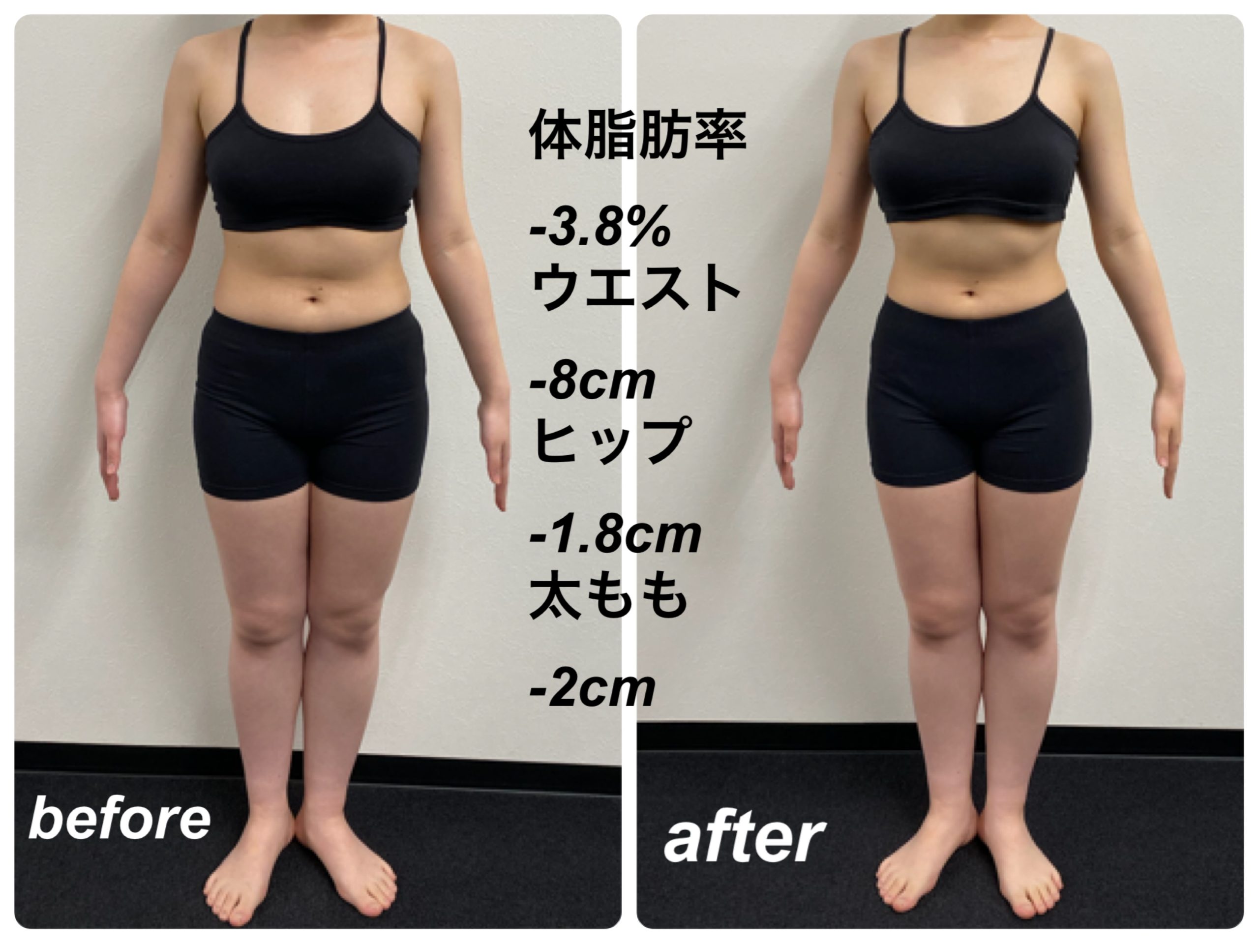 コチラのお客様は元々猫背だったのを骨盤矯正を行い、姿勢改善の結果ウエスト周りのサイズダウンに成功しているのが分かります。
