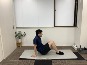 ③ 床を手で押しながら首を天井に近づけるように伸ばし3秒キープ。
