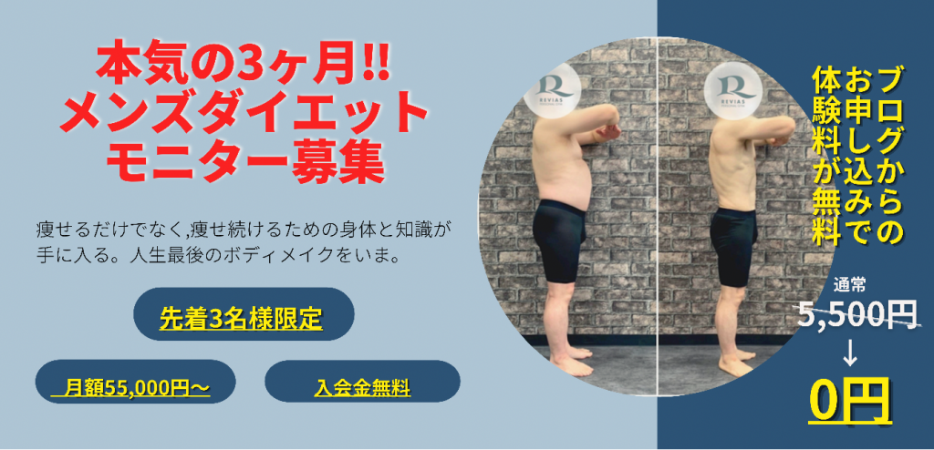 今回のメンズボディメイクモニターはそんなお悩みを抱える方をプロのパーソナルトレーナーが徹底的に支える3ヶ月間のダイエット計画になります。