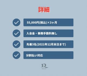 本モニター企画は3ヶ月間全24回のプログラムで総額165,000円(税込)のプランです。分割支払いにも対応していますので、月々の負担を少しでも減らしたい方はご希望の場合はお気軽にご相談ください。