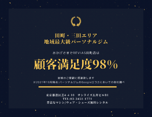 現在のREVIAS田町店のお客様満足度は※98%となっています。(※2021年11月4日時点:パーソナルジムのGoogle口コミにおいての自社調べ)