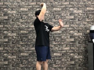 ✅肘を軽く曲げ前に伸ばします。