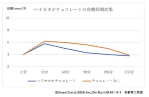 上記のグラフのように、ハイカカオチョコレートを食べる方が、食べないよりも血糖値を抑えられることがわかります。