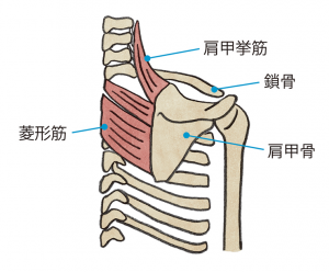 肩甲骨を上に引き上げる役割をする「肩甲挙筋」と、肩甲骨を寄せる「菱形筋」が、肩こりと深く関連します。これらの筋肉は深部にあるため、マッサージでほぐすことができません。肩甲骨を動かすストレッチによってこれらの筋肉をほぐし、肩甲骨の動きを良くすることが、肩こりの解消につながります。