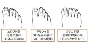 「親指」が一番長い為、先端の靴幅によって、親指が内方向へ傾き、外反母趾になる可能性が高いのもこの足のタイプです。