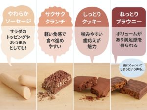 チョコバーのようなものが多いものの、低カロリー低糖質でダイエット中やトレーニング中でもお菓子の代わりとして楽しめます。