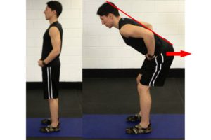 ・そのまま股関節を起点にお尻を少し後ろに引きながら(顎はしっかりひいたまま)身体を前方に傾ける