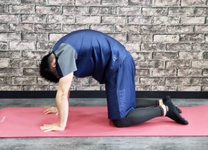 ・息を吐きながらお腹を縮める意識で、背中を丸めます