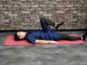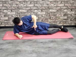・痛みの無かった方にクッションを置き両膝を横に倒してグッと力を3秒間入れ続けます