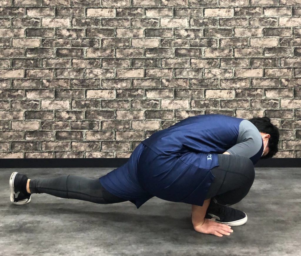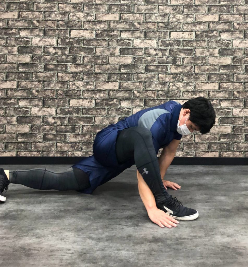 ✅腕立て伏せの姿勢から片足を前に出し、膝の下から外へ腕を出します。