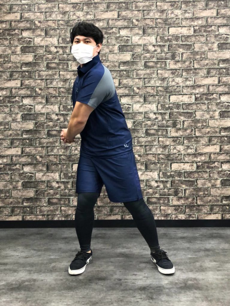 足は軽く逆ハの字に開き、手を組みながら腰の横に構えます