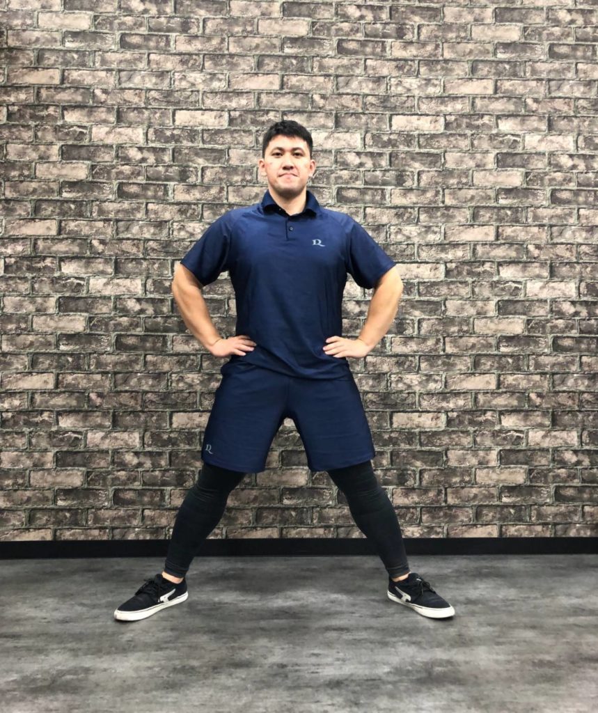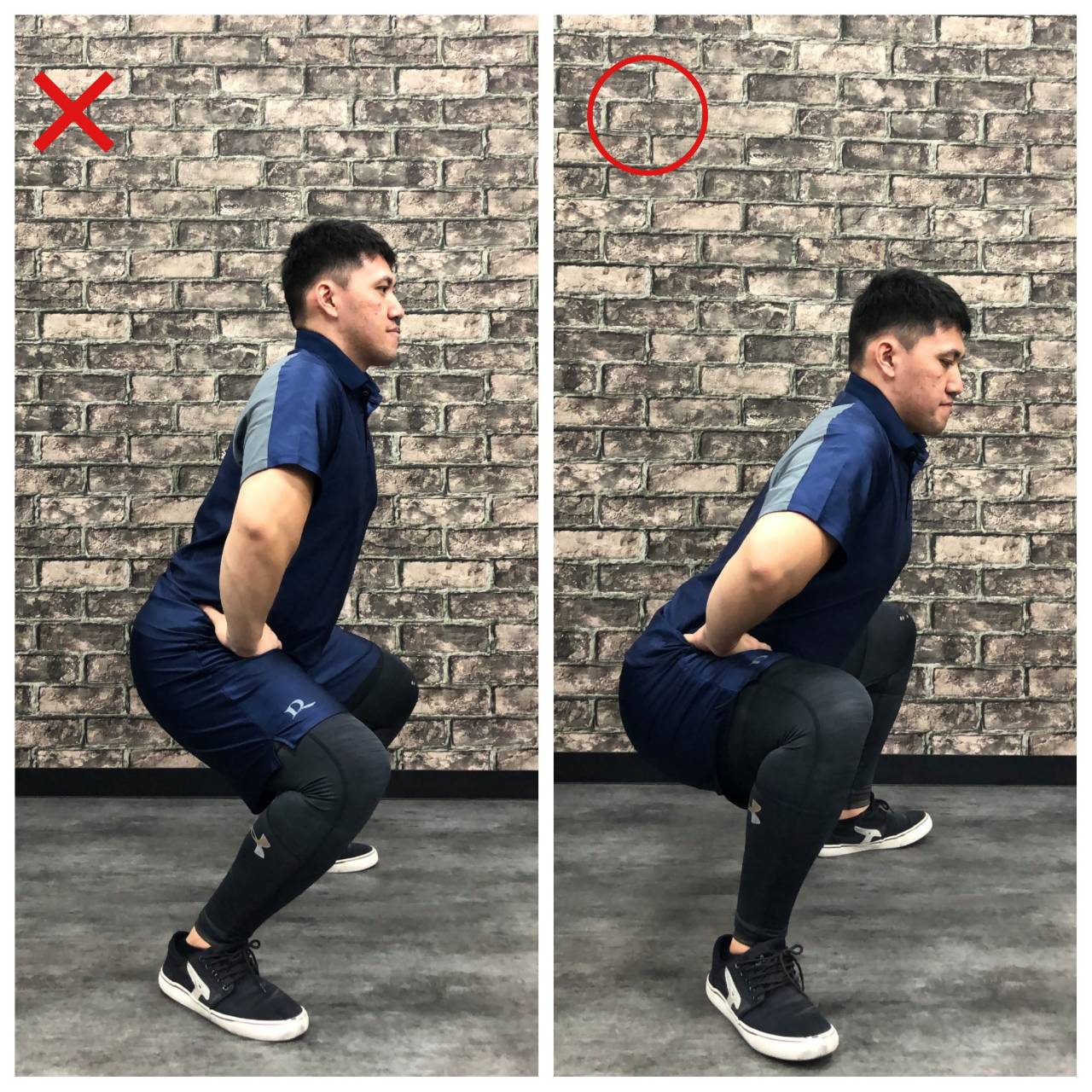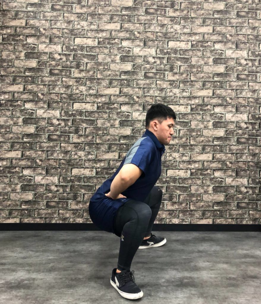 ✅そこから胸を張ったままお尻を引きしゃがんでいきます。