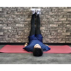 ・膝を伸ばしきり股関節が90度になるように脚を壁に付けます