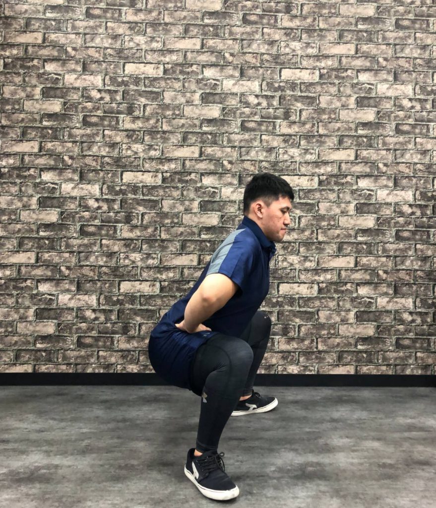 そこから胸を張ったままお尻を引きしゃがんでいきます。