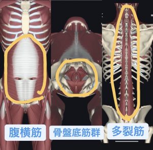 ここで、腹横筋、骨盤底筋群、多裂筋といったインナーマッスルがギュッと閉まる事により圧が抜けなくなり、腹圧をかける事ができるようになります。