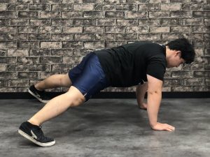✅腕立て伏せの姿勢から両足を肩幅より広く開きます。
