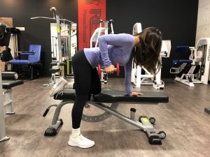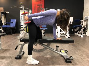 今回はジムのベンチやダンベルを使っていますが、ご自宅の椅子やソファー、ペットボトルなどで代用して行ってみてください。