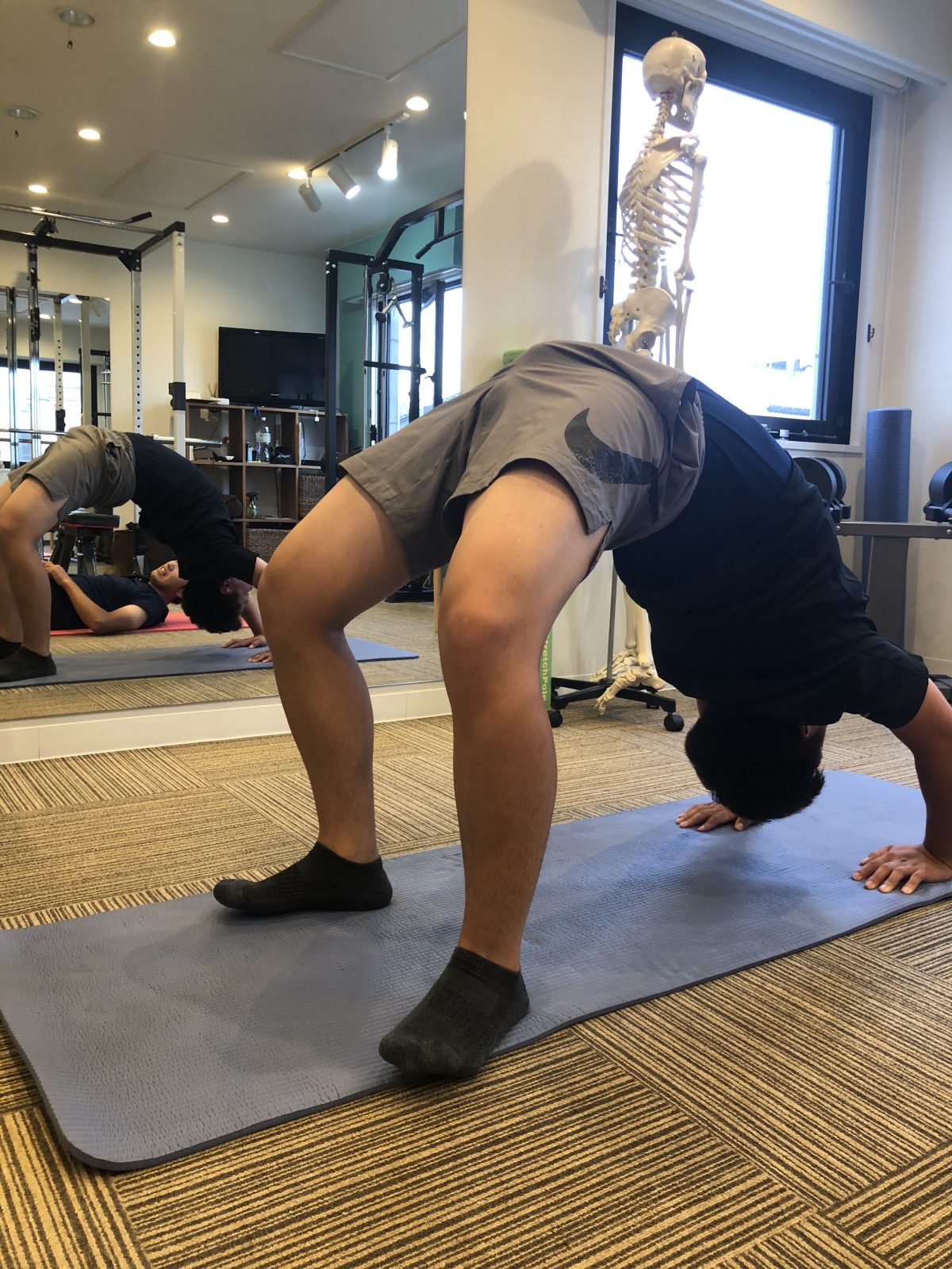 手と足は離れていてもOKで、まずは身体がしっかり反れる状態を作り、維持出来る様にして行きましょう??♂️