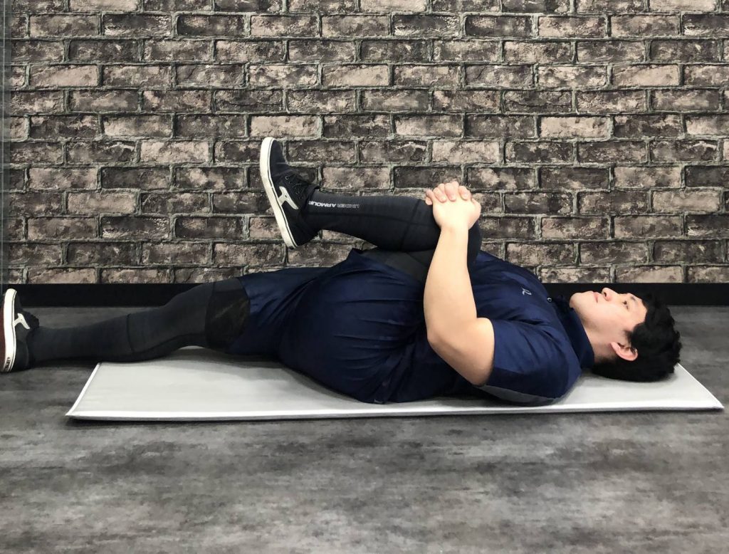 仰向けで片膝を抱え込むようにストレッチすると腰の張りを感じる場合は腸腰筋が硬くなっている可能性ありです!