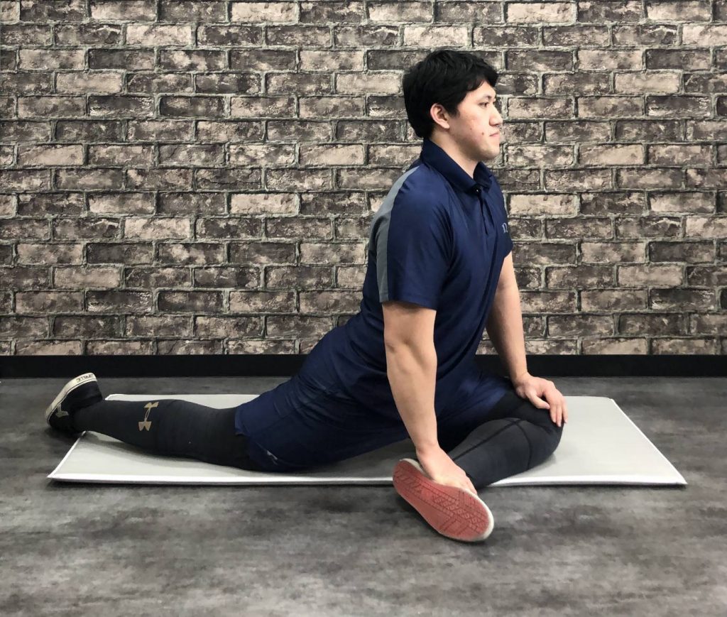 ✅伸ばした脚の膝を床につけ、腰を前に移動しながら脚の付け根をのばしていきます。