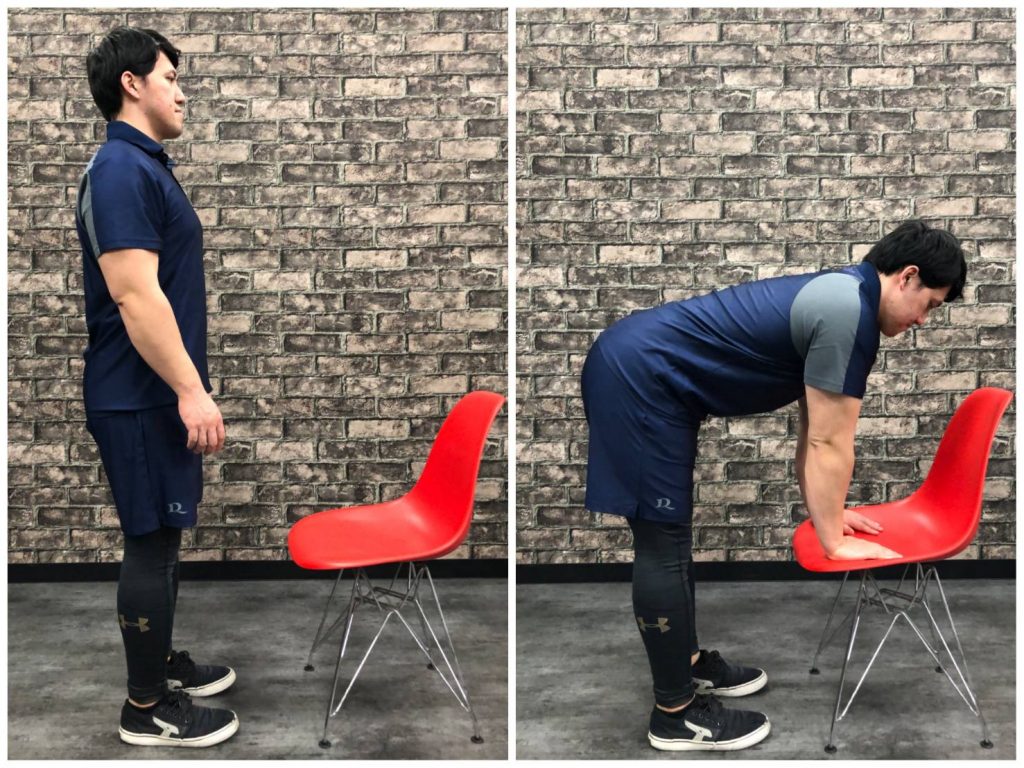 ▼椅子に手をつくように前屈を行います。