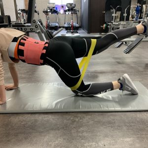 ドンキーキックは写真のように四つん這いになり片足を上に上げる種目となります。