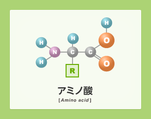 アミノ酸とは、タンパク質を作っている基本的な材料です。私たちの体を構成しているタンパク質は20種類のアミノ酸が組み合わさって作られています。