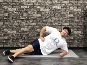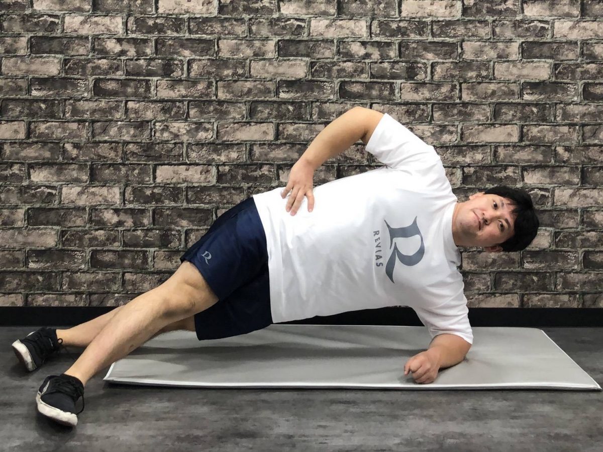 ✅そこから腰を上げて上脚・下脚・肘の三点で体を支えていきましょう。