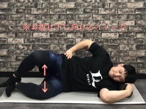 ✅膝と股関節を45°に曲げたら軽くお腹を床に向けるようにしていきます。