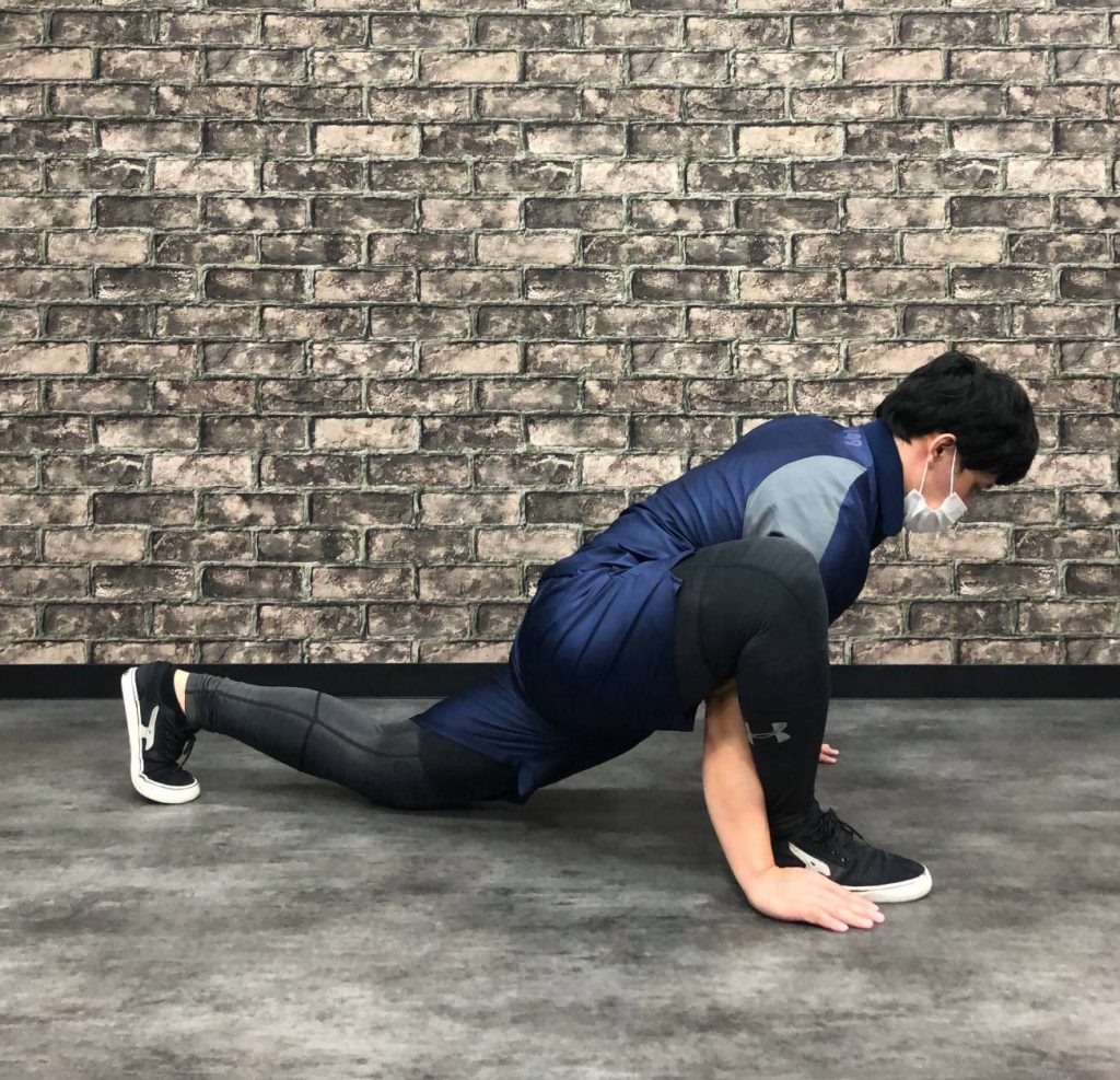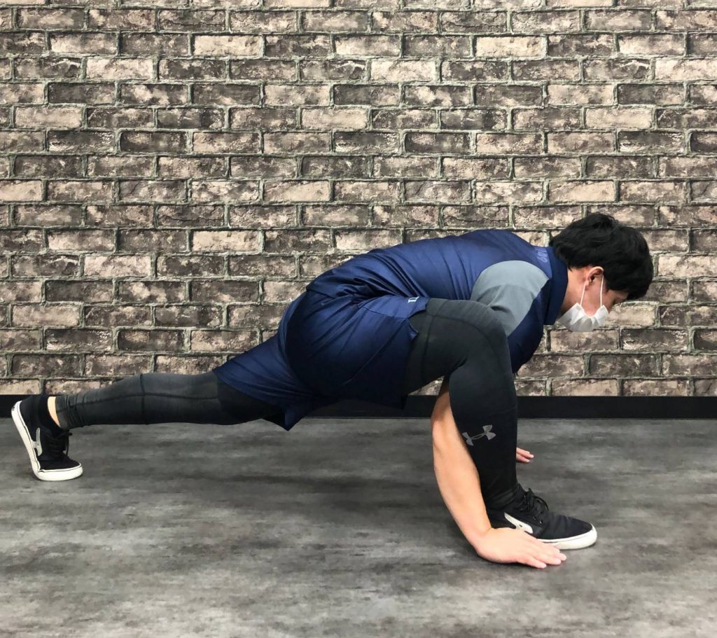 ④この時ツイストさせながら対角線上の肘、膝を近づけていきます