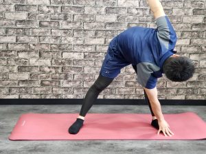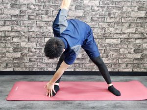・脚を肩幅に開き、まっすぐ立った状態から前屈をする