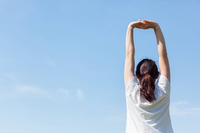 ※頭の後ろで手を組んで肘と胸を開いて首もリラックスしましょう。