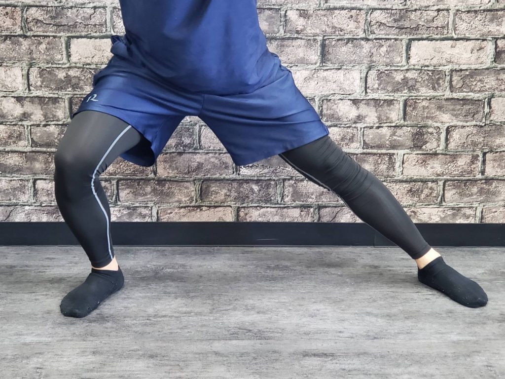・肩幅よりも広めに脚を開きます