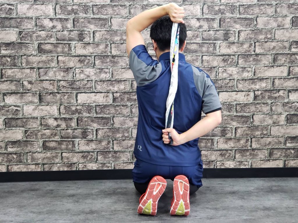 両手でタオルを持ち上の手でフレンチプレスの動作を行い、したの手で負荷を調節してあげます。