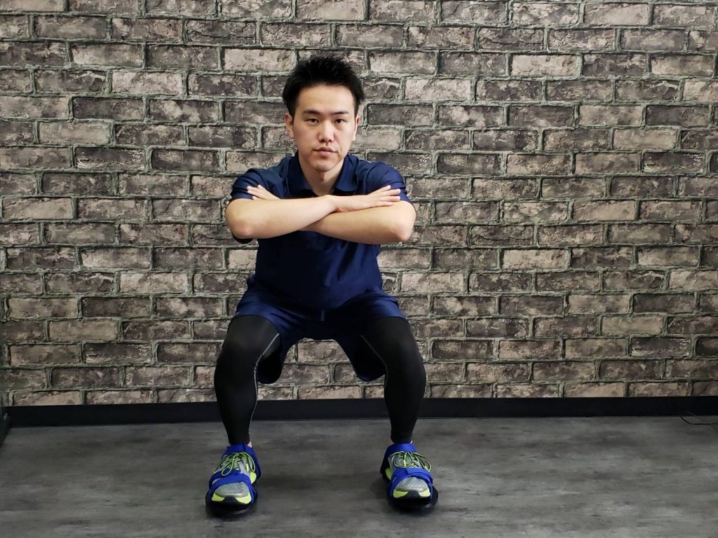 通常スタンス、ワイドスタンスどちらでも構いませんので、下ろしていく時に4秒かけてお尻を下ろしていきます。