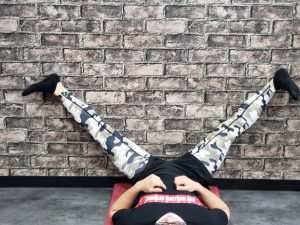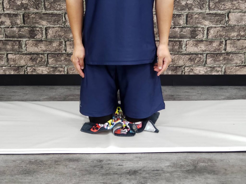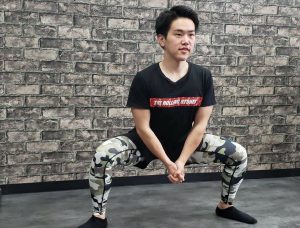 ・つま先を45度に開き、脚幅は肩幅よりも広く開きます。両手は頭の後ろ、もしくは脚の間で手を繋ぎ胸を張ります。太ももが床と平行になるくらいまでゆっくり腰を落としていき上がる際には膝が伸びきらない様に気を付けます