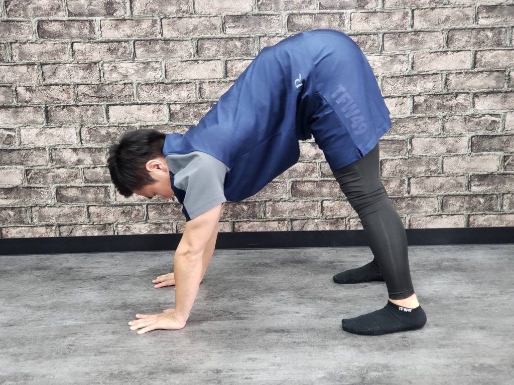 ・壁際に立ち、肩幅分ほど開いた両手を壁につけます。足は肩幅よりも少しだけ狭く、つま先立ちになり、軽く前傾気味になります。最大の高さまでしっかりとかかとを上げ、ゆっくり下ろしていきます。