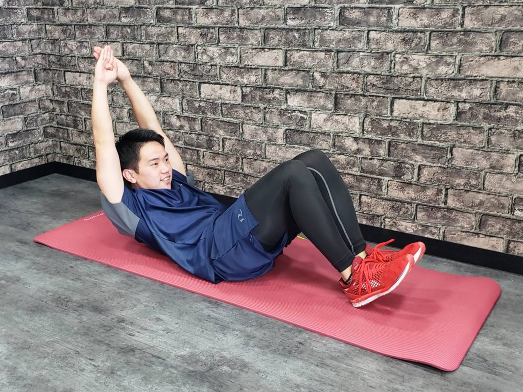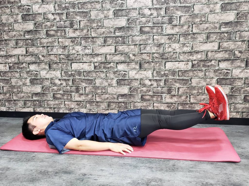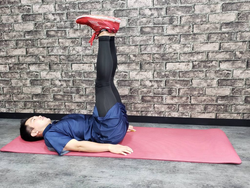 ・身体が背中側に倒れないようお腹側に倒したまま膝をあげる