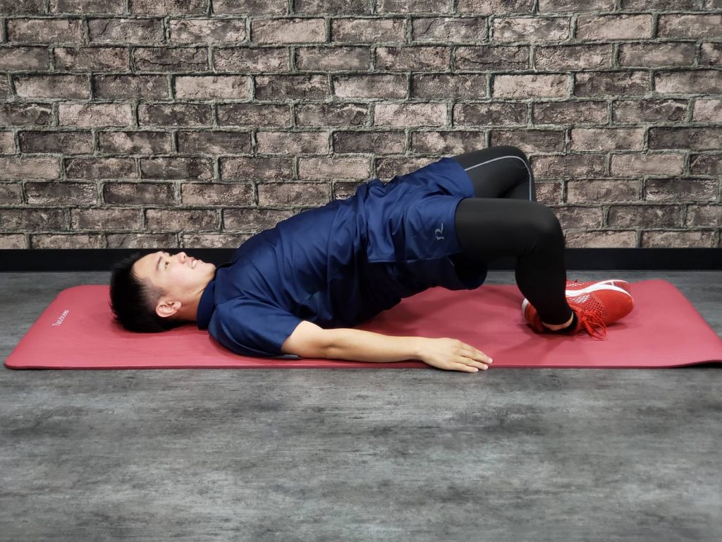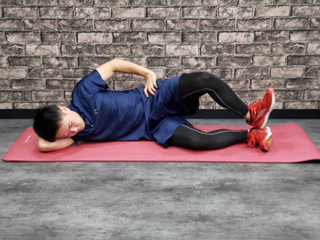 ✅膝と股関節を45°に曲げたら軽くお腹を床に向けるようにしていきます。